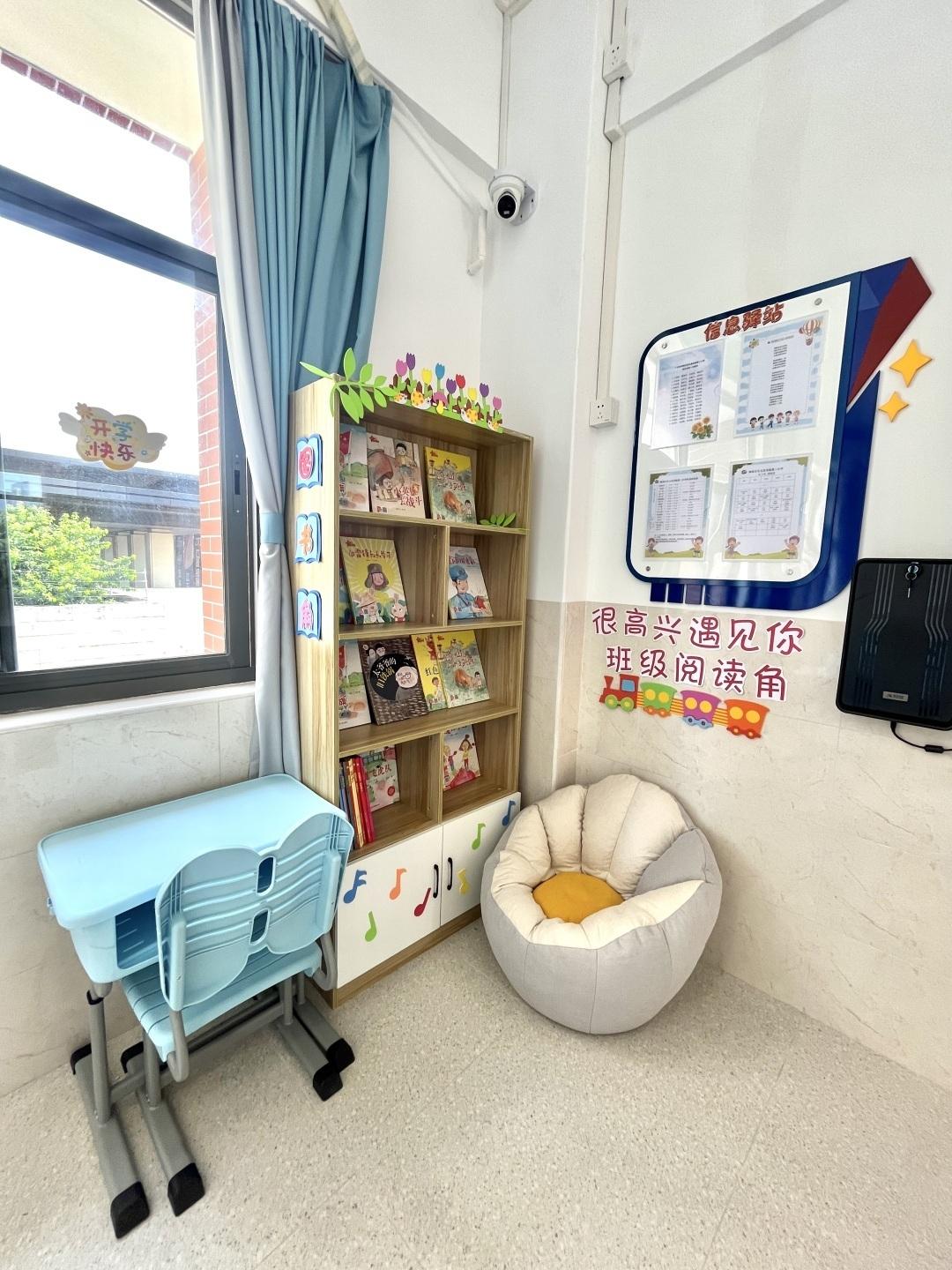 此外,校内的空间设计也体现了学校以生为本、适性而育的理念。各班老师特意在课室内打造了“幼小衔接区”——设置“动”“静”两类活动空间,例如课室后方设置有积木游戏区、绘画区、拼音识字区等,前方讲台旁则安置了一方图书角和软沙发。教室设计之变背后,是教育观的转变,力求让各个角落成为学生探索知识、“玩中学”“学中玩”的场所。