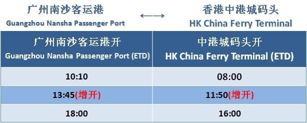 9月14日,记者从南沙客运港方面获悉,9月28日至10月7日期间,增加南沙客运港至香港中港城线航班。从日常的4班航班增加至每日6班,具体航班时刻及票价如下: