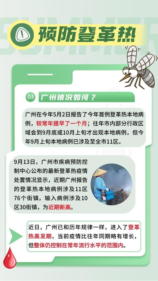 9月13日,广州市疾病预防控制中心公布的最新登革热疫情处置情况显示,近期广州报告的登革热本地病例涉及11区76个街镇,输入病例涉及10区30街镇,为近期新高。