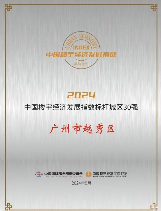 9月13日,在中国国际服务贸易交易会•2024(第四届)中国楼宇经济北京论坛上,发布了中国楼宇经济发展指数和年度评价报告。广州市越秀区在“2024中国楼宇经济(总部经济)标杆城区”榜单名列前茅,位列第7,同时还被评选为“中国楼宇经济营商环境示范城区”。在活动现场,越秀区开展投资推介,广邀海内外有识之士做越秀发展的“最佳合伙人”,越秀也将用心当好“金牌业务员”,用情做好“首席服务员”,彼此双向奔赴、共筑未来。