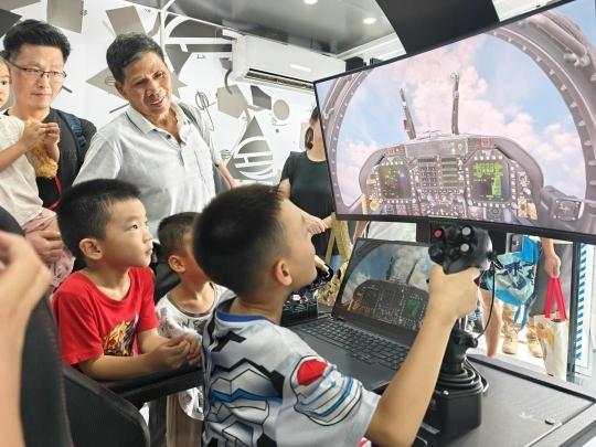 国防教育主题大篷车设置国防宣讲区、模拟飞行区、模拟射击区、产品展示区等区域,在模拟飞行区,小朋友左手操纵“油门推杆”,右手控制“方向舵”,随着“战机”缓缓升起,视野逐渐开阔,小朋友玩得不亦乐乎;在VR射击区,孩子们戴上VR眼镜,手持遥控器,体验仿真射击环境;在航母舰队主题区,孩子们了解核动力系统、飞行甲板等现代航母先进技术,了解航母起源与中国的“航母之路”。