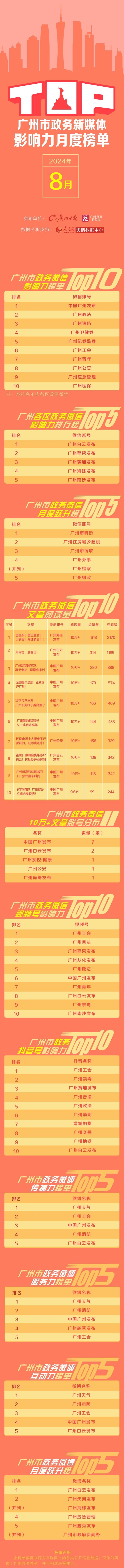 由广州日报主办、人民网舆情数据中心提供数据分析支持的广州市政务新媒体影响力榜单(2024年8月榜)于2024年9月24日正式公布。2024年8月,广州市政务新媒体重点关注广州重大项目工程建设、巴黎奥运会体育赛事领域话题。