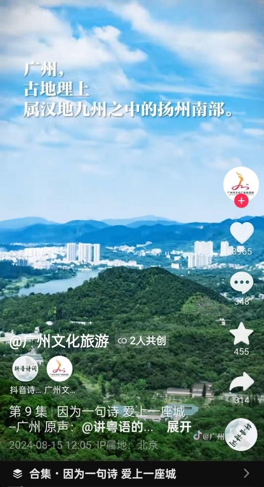 广州文化旅游:与@抖音诗词 发布粤语读唐诗共创视频,创新表达、传播广州城市形象