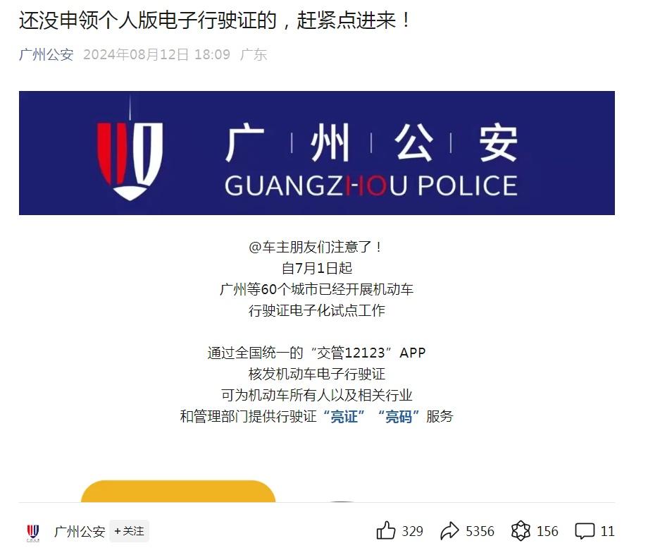 为深化行政管理服务改革,持续深化公安行政管理服务改革,自7月1日起,广州等60个城市已开展机动车行驶证电子化试点工作,为机动车所有人以及相关行业和管理部门提供行驶证在线“亮证”“亮码”服务,更加便利群众企业办事。