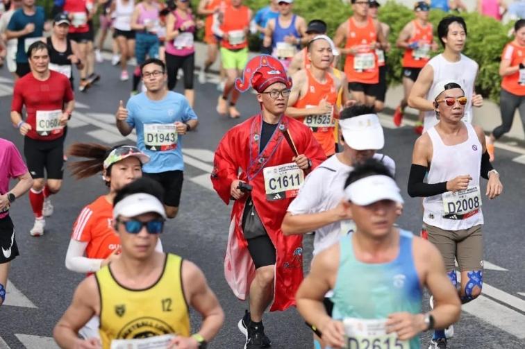 身穿粤剧戏服的市民开心为马拉松跑手加油