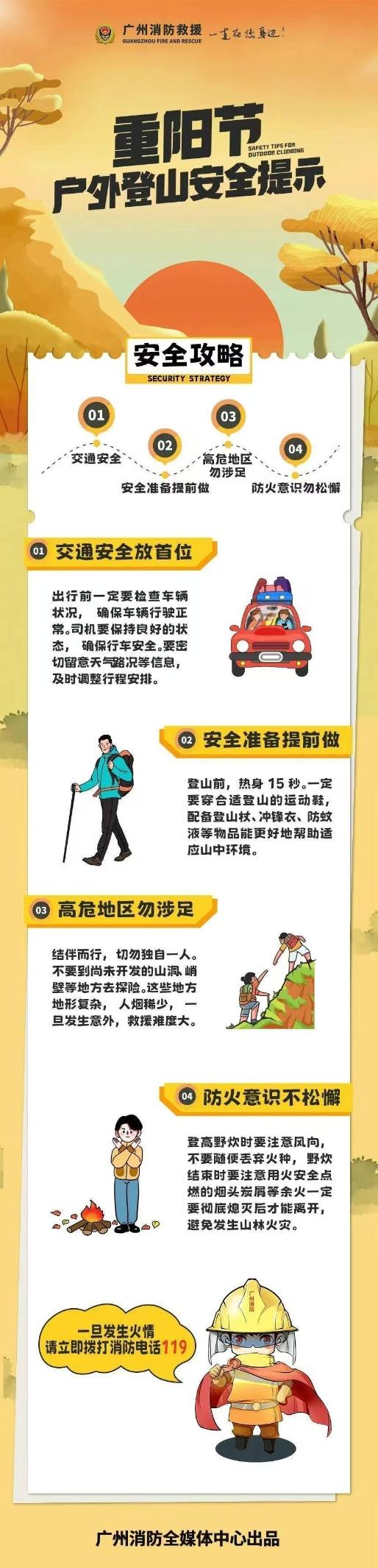 其中,针对白云山,重阳期间广州消防将在山顶公园、明珠楼、山庄旅舍和索道下部站等部位设置临时执勤点,负责周边区域灭火及应急救援工作。
