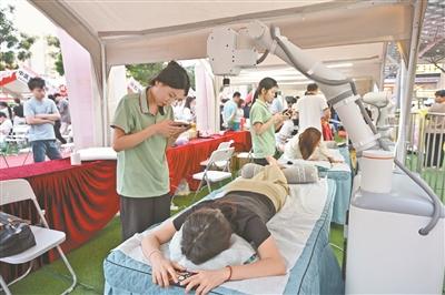 “我们常常觉得中医是一些中老年人才会喜欢的东西,没想到它的年轻受众也很多。现场来体验的年轻人非常多,说明中医药在年轻人中也非常有市场。”广州医科大学附属市八医院中医科主任、主任中医师林路平介绍,“我们现场提供了一些适合年轻人的项目,如简易版的雷火灸,可以帮助疏通督脉,有效预防秋冬的一些呼吸道疾病;穴位贴敷腹部,可以帮助消化系统的运转,以及解决一些年轻女性的痛经问题;还有太极微针,特别适合那些长期伏案工作、肩颈痛的年轻人,或睡眠不好的年轻人,做一次就会有很好的缓解作用。”