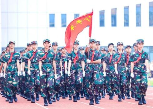 在分列式展示中,全市各级少年军校代表队学员们身着统一的迷彩服,列队站在操场上。随着激昂的军乐响起,各个方队依次跟随军旗,按大会指挥员口令,整齐划一地通过主席台。