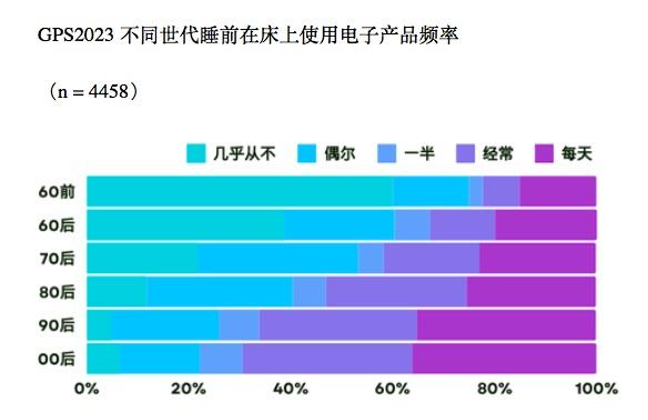 睡前使用电子产品的习惯在各年龄段普遍存在,尤其在90后和00后中更为显著,睡前手机使用率超过60%。虽然调查显示受访者平均睡眠时长为7小时,但超过半数年轻人反映睡眠质量不佳。这可能与睡前长时间接触电子设备有关。