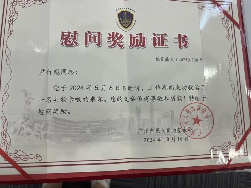 正在行驶的公交车上,一名乘客突然被异物卡喉,倒地抽搐。危急之际,车长尹行彪临危不乱,将车靠边停稳后,和车上其他热心乘客一起采用海姆立克急救法展开救助,最终仅仅耗费一分钟左右时间就化险为夷。16日,广州市见义勇为基金会举行慰问奖励活动,尹行彪因见义勇为之举获得奖励。