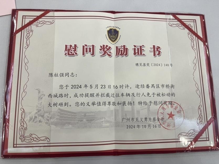 “停下,快停下!前面有棵大树马上就要倒了!”大雨中,川流不息的道路中央,陈柱强大声呼喊提醒来往车辆注意避让,正因为他的挺身而出,未雨绸缪,才避免了伤亡发生。16日,陈柱强等近期涌现的68位平民英雄,相继登上领奖台,获颁广州市见义勇为基金会慰问奖励。