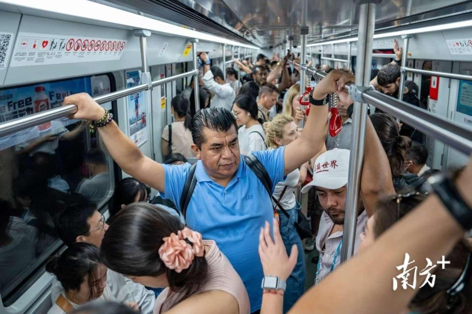 10月17日上午,广州地铁八号线上,境外参展商挤满了整个车厢。