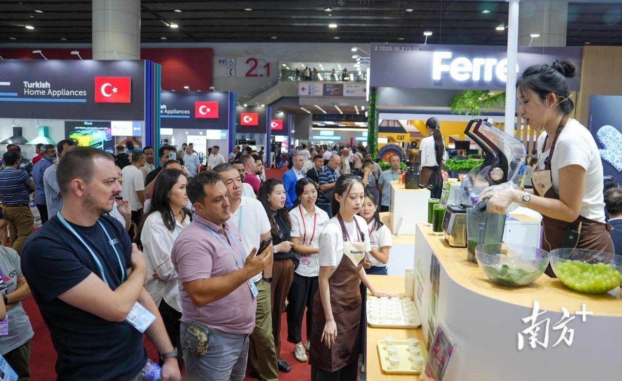 10月17日,广交会进口展区,一家企业的工作人员现场演示榨汁机使用方法,吸引众多采购商围观品尝。