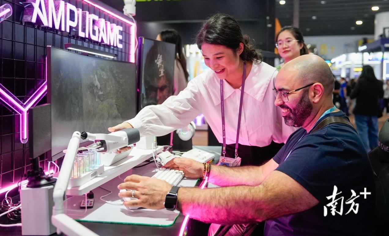 10月17日,来自广东肇庆的电子设备搭配上今年爆火的游戏“黑神话:悟空”,让外国客商忍不住试玩。