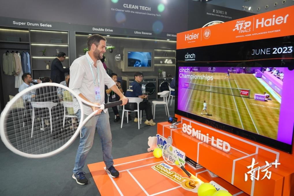 10月17日,广交会家用电器展区,LED屏幕上播放网球画面,采购商兴奋地挥舞着球拍。