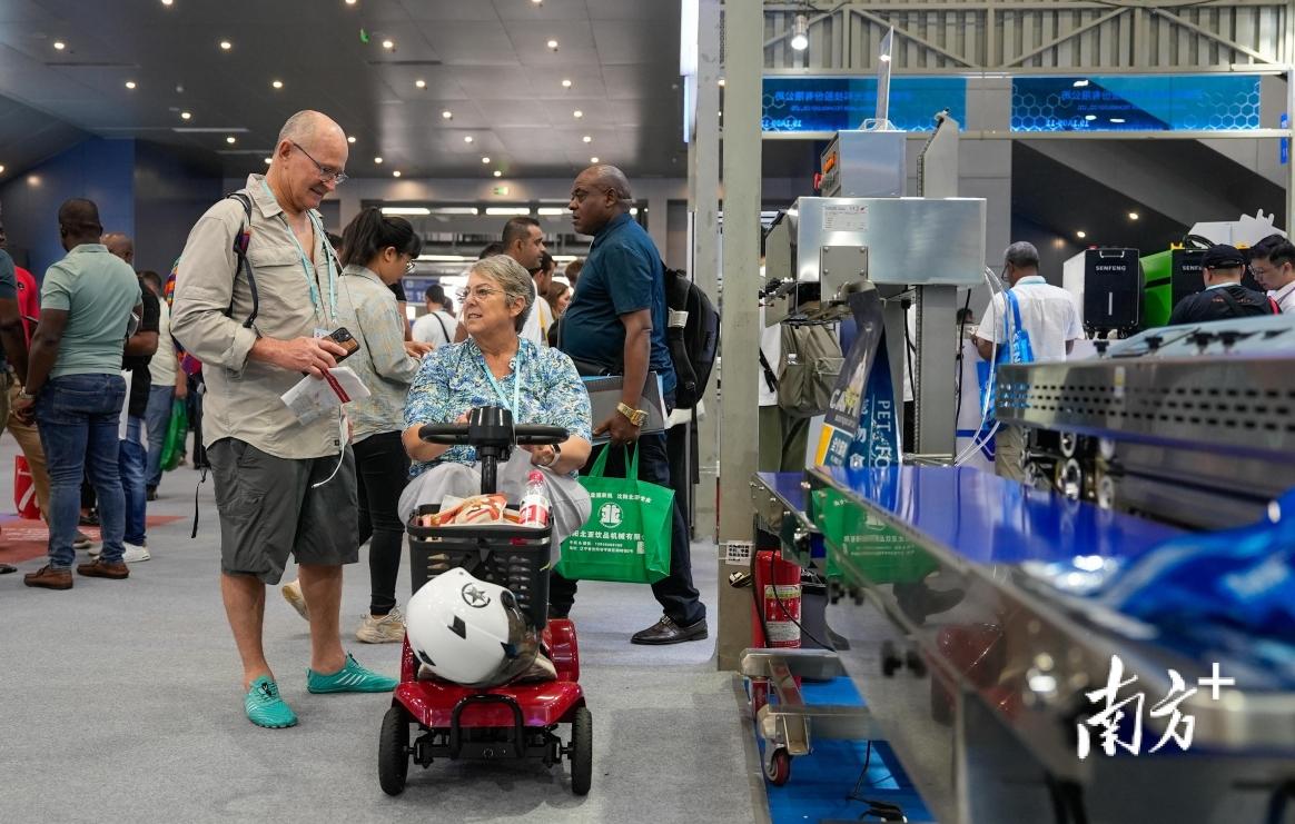 10月17日,年纪较长的外国采购商驾驶代步车畅游广交会。