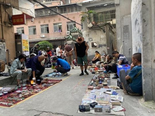 康王中路里巷沿街都是玉器档口。而文昌北路一带是广州有名的珠宝玉器、古旧红木、文玩古董商店集中地,每周二都有文玩天光墟,兴光里不少店铺也是文玩店铺。记者看到,周边无奇不有,钱币、玉器、珠宝、旧家具等,不管是残品,还是保存完好,都可以拿来摆卖。“我们这里是旧物市场,当然什么都有,你要看上我的手镯,我也能卖给你。”一位摊主表示。