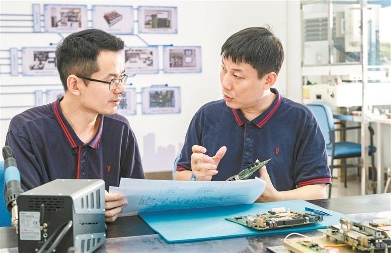 李天明(右)在和同事讨论方案。