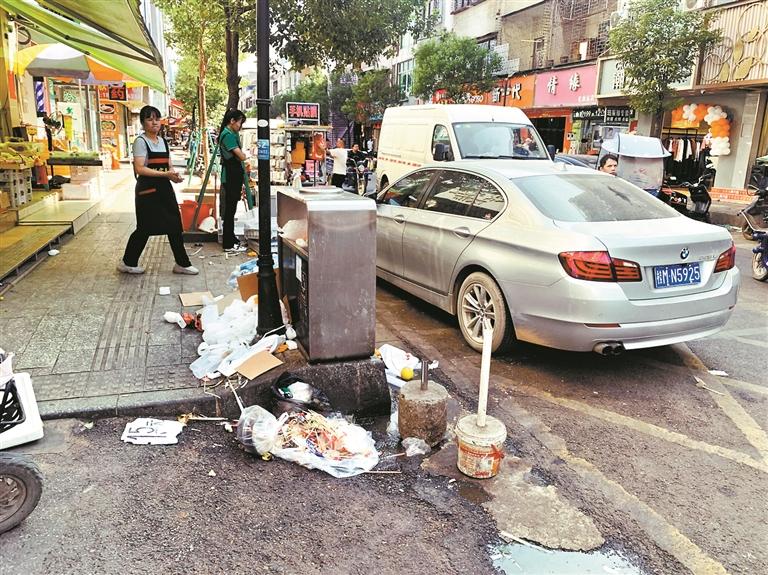 市场外围道路地面,到处都有垃圾堆,也有摊贩随地扔放的杂物和垃圾,垃圾桶堆满后未及时清理,造成垃圾外溢洒地。