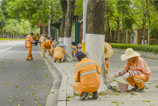 根据气象部门预测,本月18日前后,广州可能受到中等强度冷空气影响。面对即将到来的降温天气,近期,白云区城市管理和综合执法局(以下简称“白云区城管局”)组织绿化养护工人,对辖内4.3万株行道树进行涂白作业,给树木提前穿上了“秋裤”,以增强树木抗寒、防冻、防虫能力。
