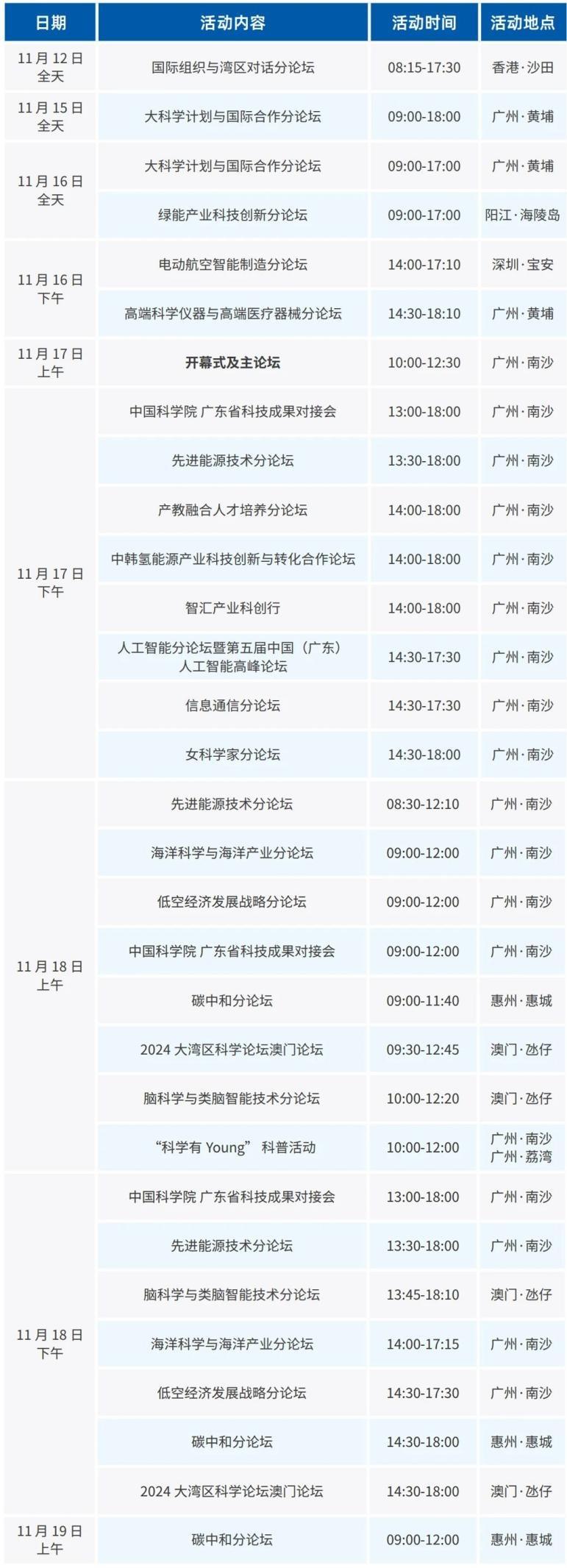 11月16日至18日,2024大湾区科学论坛在粤港澳三地同步举办。本次论坛以“开放科学 勇立潮头”为主题,设置开幕式、主论坛、14场分论坛和5场特色活动,其中开幕式、主论坛、7场分论坛、4个特色活动等亮点活动,均在南沙科学城精彩呈现。