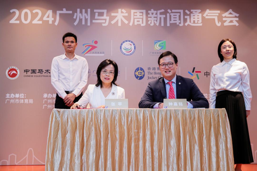 广州市体育局党组成员、副局长赵灵峰,广州市马术协会会长、广州体育职业技术学院副院长张苹,香港赛马会赛马项目管理办公室主任钟嘉铭以及广州市体育局体育产业处、广州市群众体育指导中心、广州市体育竞赛中心、广州市体育彩票管理中心、广州泰骏国际马术中心、广州市协信展览代表出席了赛前新闻通气会。