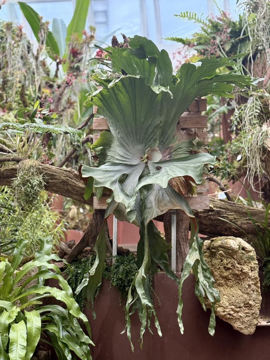 在云萝植物园兰亭A馆内,可以欣赏到形态优雅的女王鹿角蕨,长达2米的体型,可谓华南地区女王鹿角蕨之最。其营养叶厚且高大,宛如一顶精致的女王冠冕,象征着高贵与典雅,而孢子叶形态酷似鹿角,展现出原始而震撼的自然之美,让人仿佛置身热带雨林的神秘氛围中。