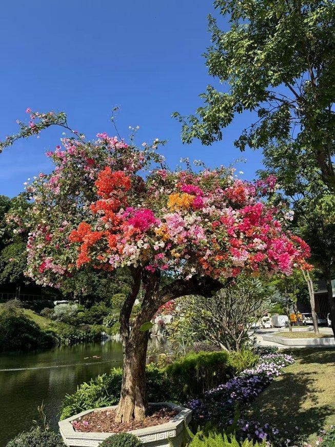 云萝植物园“请”来了一位高达4米、树龄超过50年的“老元尊”——五雀簕杜鹃,花期可达260天,它通过嫁接技术实现“一树多花”,每逢11月,绿樱、红樱、波伊斯玫瑰、绿叶宫粉、柠檬黄等新优品种集中开花,形成了一幅绚丽多彩的画卷。