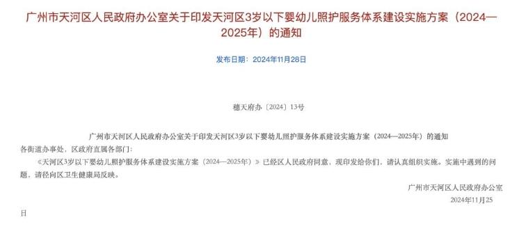 《方案》明确,2024年,全区打造1个具有天河特色的区级托育综合服务中心,70%的街道建有公建民营普惠托育机构,各街道40%的社区设有社区托育点。