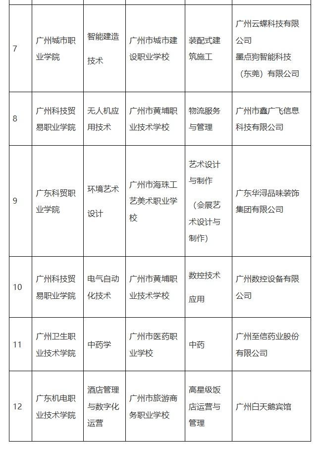 名单显示,每一个试点包含高职院校、高职专业、对口中职学校、对口中职专业及合作园区与企业。新一轮扩容涉及广州番禺职业技术学院、广州铁路职业技术学院、广州城市职业学院、广州科技贸易职业学院、广东科贸职业学院、广州卫生职业技术学院、广东机电职业技术学院等,对口的中职学校有广州市纺织服装职业学校、广州市黄埔职业技术学校、广州市信息技术职业学校、广州市交通运输职业学校、广州市轻工职业学校、广州市城市建设职业学校、广州市海珠工艺美术职业学校、广州市医药职业学校、广州市旅游商务职业学校等。从入选专业的数量看,广州市黄埔职业技术学校有3个,位居第一。