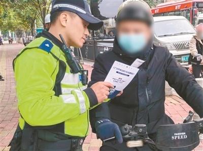 执勤民警向电动自行车驾驶人现场普及新规内容。 图/广州交警提供