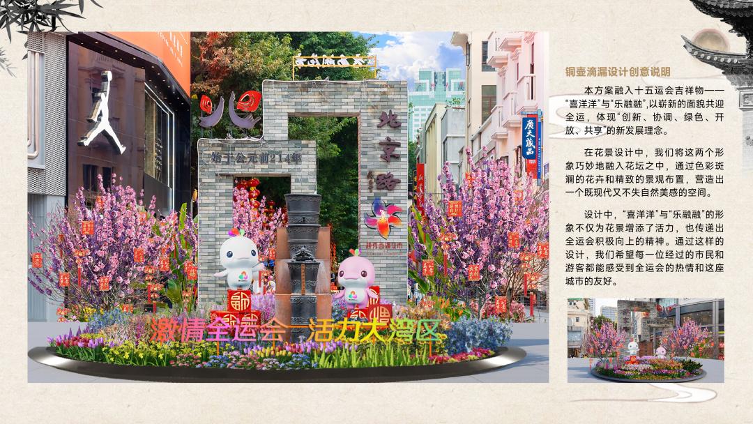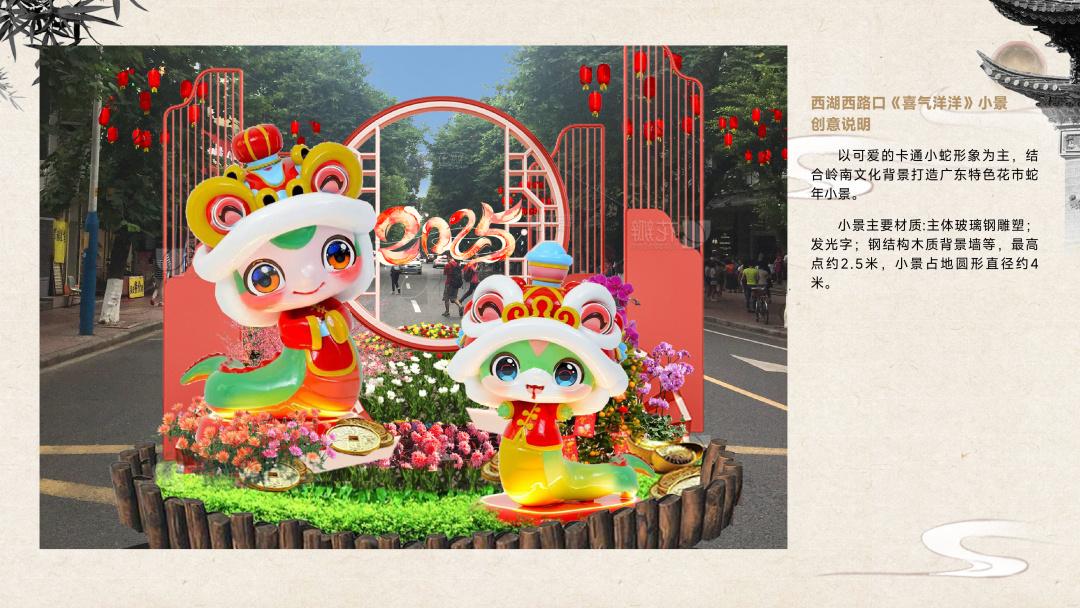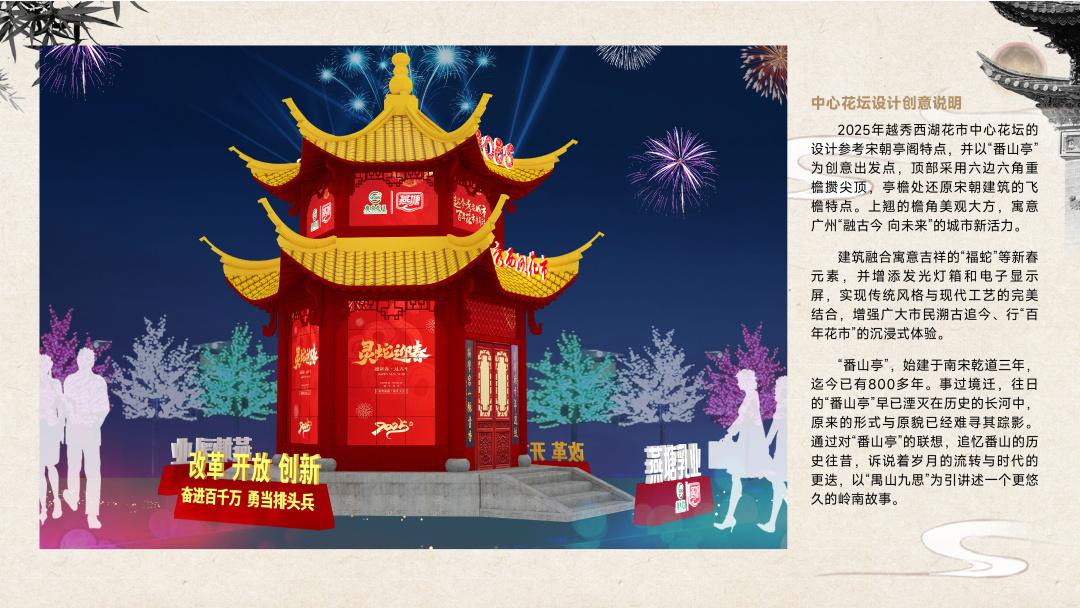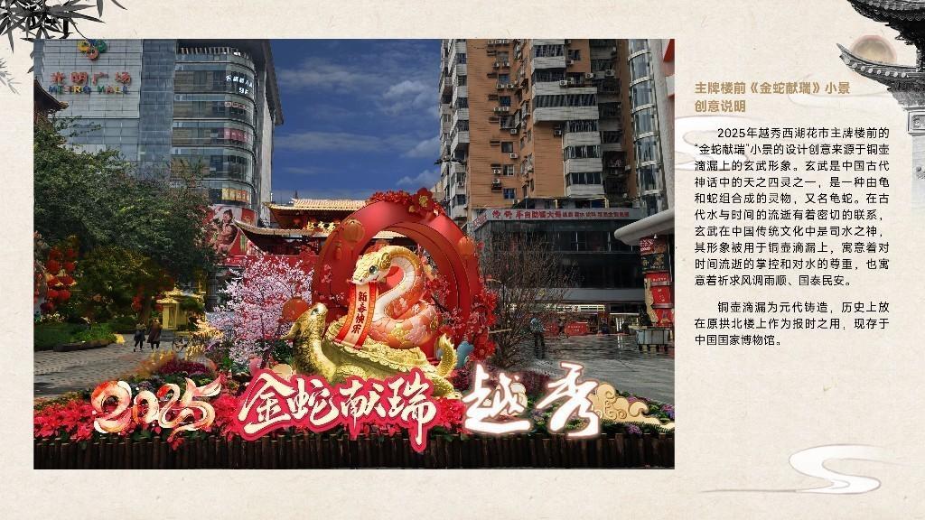 2025年,越秀西湖花市所有景观景点都深入挖掘广府文化底蕴,引发市民文化记忆的共鸣,持续释放“百年花市”魅力。花市主牌楼以“海山楼”为原型设计,让西湖花市“跨越山海”,向市民游客讲述一个更开放的千年商都广州故事;主题蛇年生肖造型,源自北京路铜壶滴漏上的玄武神兽,讲述一个更喜乐长安宁的广府故事;中心花坛借鉴“番山亭”历史,讲述一个更悠久的“番山九思”岭南故事;铜壶滴漏花景中,第十五届全运会吉祥物中华白海豚“豚跃拱门”,讲述一个更活力的大湾区故事;花城花街围绕“赏花容越貌、秀魅力花城”主题,在北京路南段打造“莳花集”,讲述“永不落幕的花市”美丽中国的故事;通过越秀西湖花市,让城市留下记忆,让人们记住乡愁,集城脉、商脉、文脉于一体,以古越今秀为核,讲述一个新时代“老城市新活力”的故事。