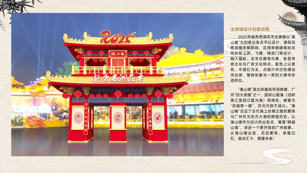 祥龙回首留胜景,金蛇起舞贺新春。西湖花市主牌楼将以“海山楼”为原型设计,“跨越山海”向市民游客讲述一个更开放的千年商都广州故事。