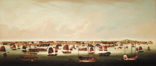 在大英博物馆收藏的广州外销画,大部分反映了岭南地区港口风貌、地志风景和园林景色。其中,被称为“广州清明上河图”的《广州港和广州府城长卷》,是外销画风景题材中描绘港口风景最为精妙绝伦之作。这是一幅长9.2米,高0.74米的水粉画,为当时最大的一幅外销画卷。画作用真丝做底框,以广州港、广州城及珠江沿线的风景为主题,从广州城西沿珠江上游的黄沙及柳波涌的西炮台到广州城东的珠江下游的大沙头东,东西长9000米的景象绘制在一张作品中,有200多处大小码头和各种中西式建筑,还有或停靠或航行的船四五百只。岸边和船上的人物有六七百之多,场面宏大,内容丰富,生动再现了当时广州城的繁荣盛景。