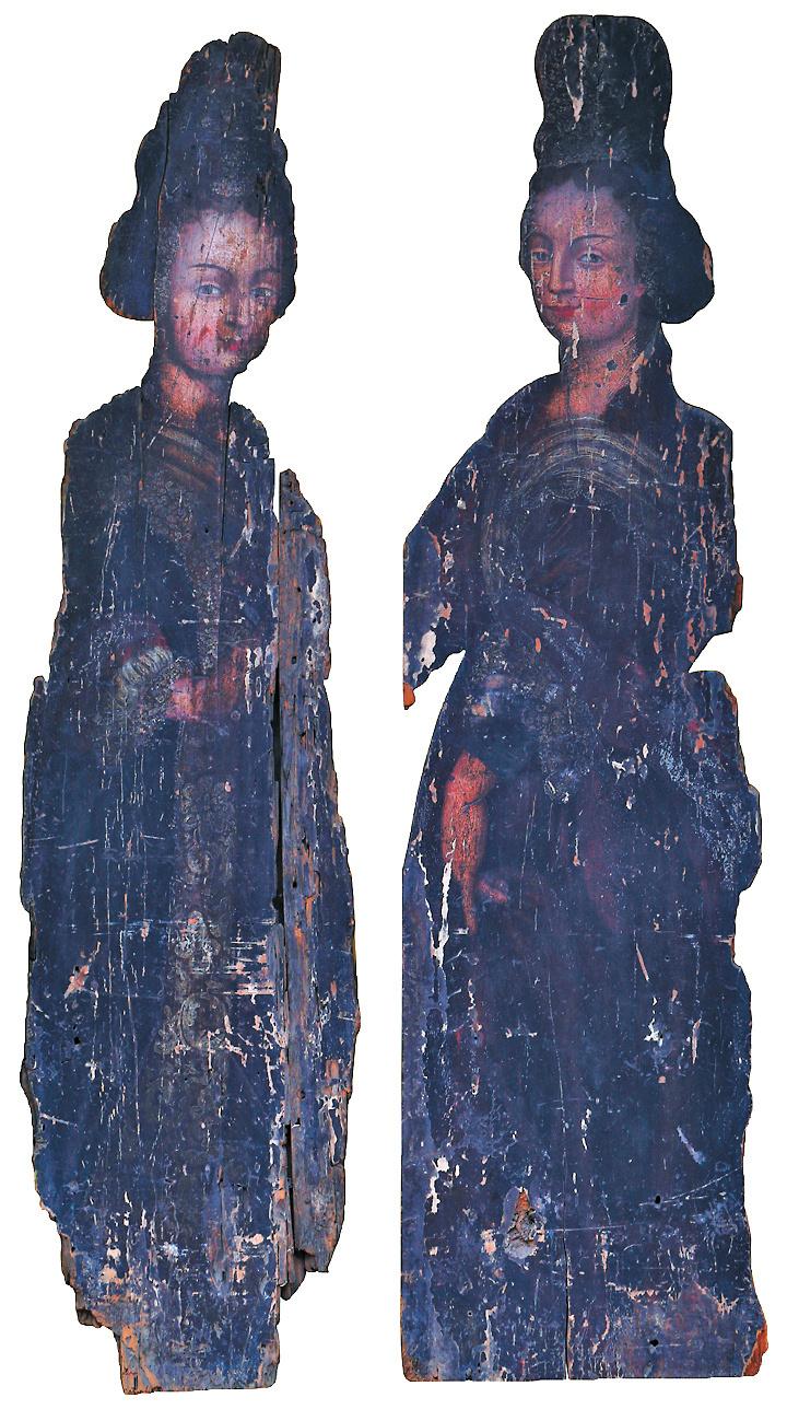 在珠三角江门市新会博物馆,珍藏着一套被誉为“木美人”的艺术品。这是一对绘制在厚度约4厘米木板上的女性肖像油画,画中女子几乎与真人一样大小,采用西方古典油画技法绘制,体态婀娜、眉目传神、栩栩如生,面目带有西洋女子特征。其造型与技法同欧洲十五六世纪绘画中描绘女子及圣母像的方式相近。但着装为明代服饰,汉式发髻。“木美人”被认为是中国现存最早的油画实物。“木美人”的年代至今未有定论,有“明代中叶说”,也有人认为是明代晚期至清早期的作品。