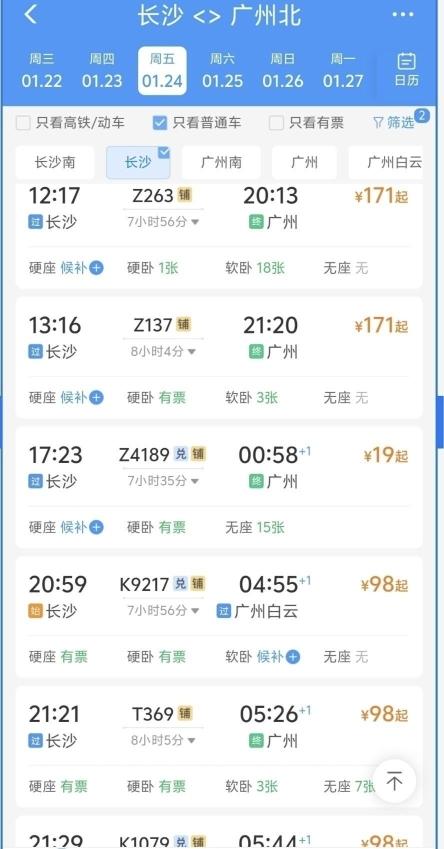 广铁集团列车折扣主要涉及区间:节前1月14日至1月28日从长沙、南昌、成都、重庆、南宁、贵阳北等方向开往广州、深圳、佛山、珠海等方向,共计72趟春运列车实施票价优惠。节后1月29日至2月22日从广州、深圳、珠海、佛山等方向开往南昌、成都、长沙、西安、茂名南宁东等方向共计71趟春运列车实施票价优惠。如有购票需求,使用“铁路12306”手机客户端,选择出发站、到达站及出发时间后,可通过界面最底部的“价格最低”选项进行筛选,更快找到所需车次打折的车票,在车次的票价后会标注折扣率。