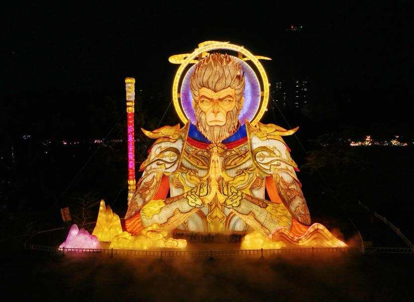 16米高的齐天大圣威武霸气。灯组将经典神话形象孙悟空进行独特的暗黑风格重塑,打造具有强烈视觉冲击力与文化内涵的神话人物新形象。大圣眼神坚定,守护一方平安。