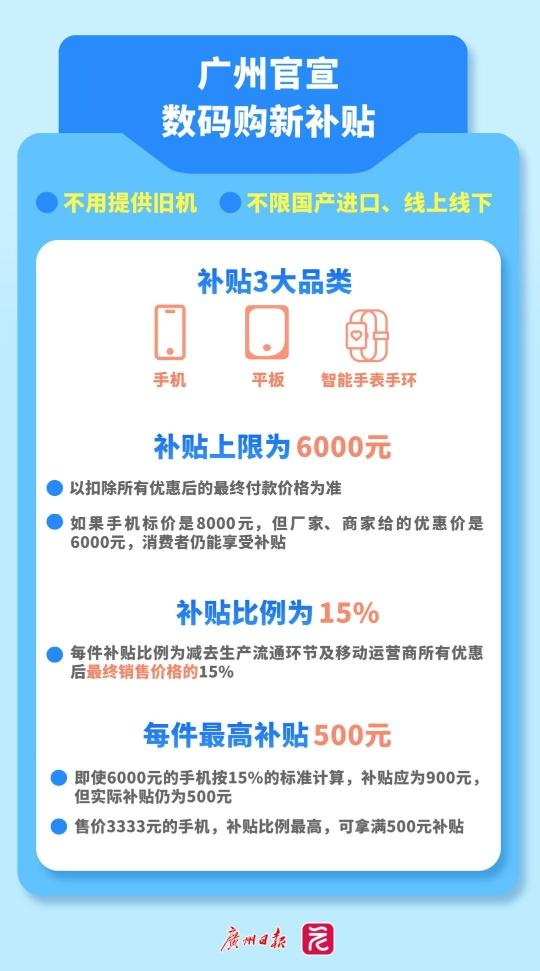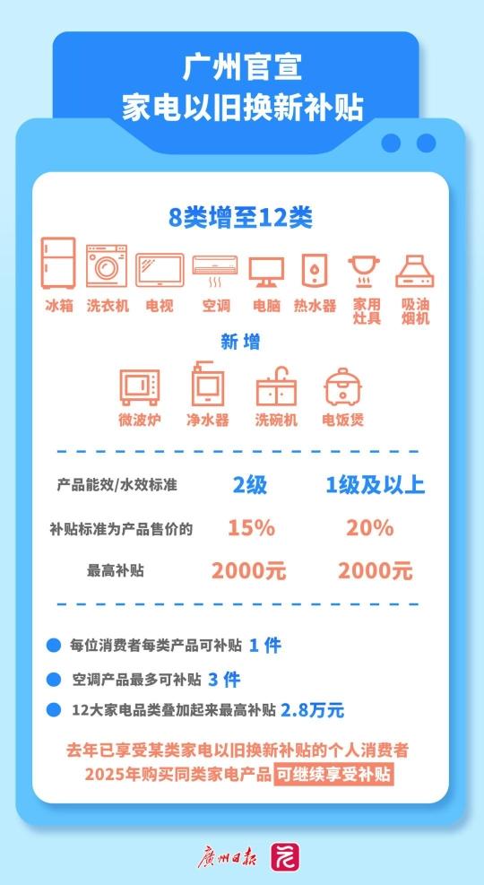1月20日,广州官宣家电、数码以旧换新补贴,合计最高补贴2.95万元。其中: