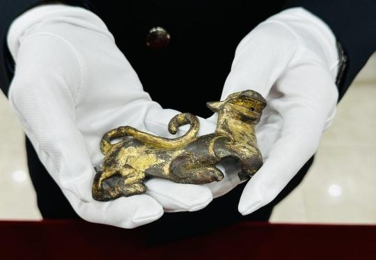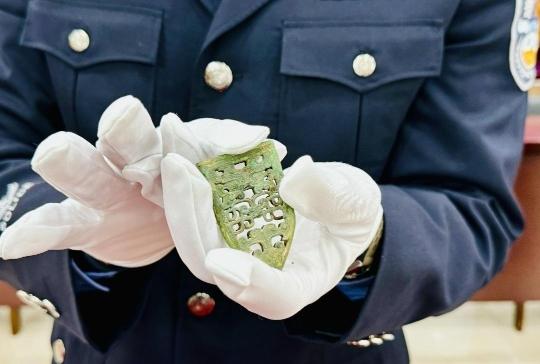 发布会现场展示了广州警方追缴的部分文物。“这两件都是三级文物,分别是春秋时期的青铜镂空剑标和汉代虎形嵌件。”广州市公安局刑警支队二大队教导员李彦介绍,广州警方2024年追缴的文物中有11件经鉴定为三级文物。