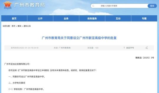 关于同意设立广州市新亚高级中学的批复显示,广州市教育局同意广州市亚加达发展有限公司设立广州市新亚高级中学。据悉,广州市新亚高级中学为非营利性民办学校,位于广州市南沙区南沙街广生路14号,办学内容为全日制普通高级中等教育,将招收符合广州市招考办招生要求的初中学生,办学规模上限为1000人,即该校最多可提供1000个高中学位。