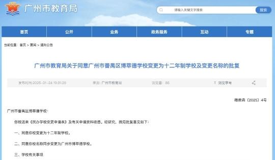 关于同意广州市番禺区博萃德学校变更为十二年制学校及变更名称的批复显示,广州市教育局同意广州市番禺区博萃德学校变更为十二年制学校,并更名为广州市博萃德学校。