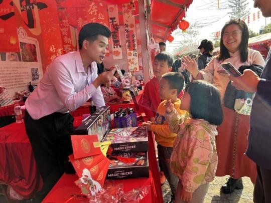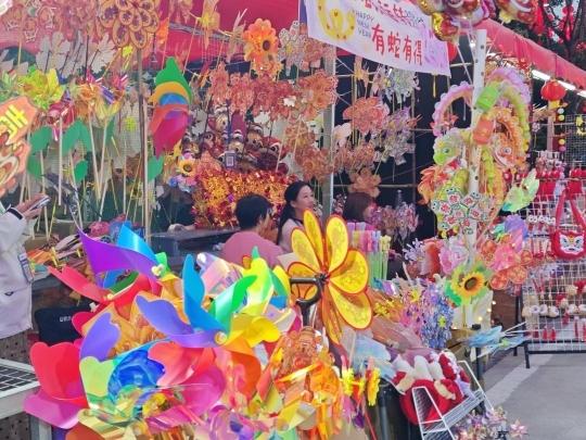 鲜花、工艺品、金鱼……246个花市档位上,各类花卉争奇斗艳,蝴蝶兰似彩蝶飞舞,百合散发淡雅清香,挂满枝头的金桔寓意吉祥,还有一众精美的手工艺品。