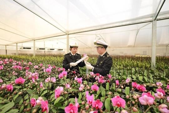 负责检疫这批年花的,是佛山海关驻顺德办事处属地外勤科的关员佘嘉鑫。与往常一样,他和同事驱车数十分钟来到顺德陈村出口花卉种植基地。佛山顺德是全国最大的花卉集散地之一,也是全国最大的出口蝴蝶兰和年桔种植基地。“顺德国兰”“陈村年桔”等品牌享誉国内外,每到岁末年初,一批批喜气盈人的年桔年花便从这里发往世界各地。