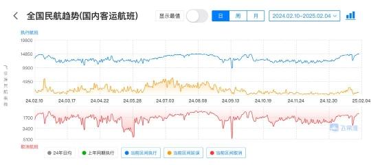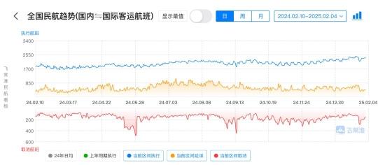 2025年春节假期间(1月28日-2月4日)国内航线实际执行客运航班量11.27万班次,同比2024年春节(2月10日-2月17日)下降0.70%;国际及地区航线实际执行客运航班量1.84万班次,同比2024年春节增长21.40%。值得注意的是,2月3日(正月初六)国内航线单日客运航班量执行最多,为14768班次。2月4日(正月初七)国际及地区航线单日客运航班量执行最多,为2368班次。