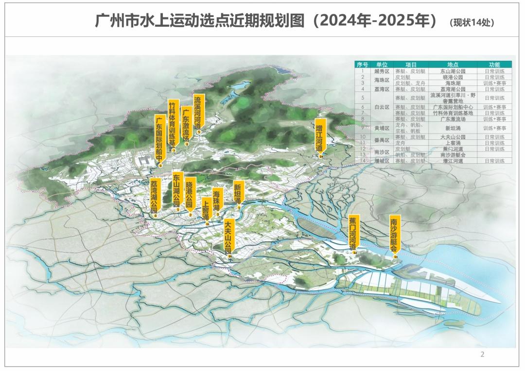 总体布局方面,选择适宜开展水上运动的河涌规划布点89处,分近、中、远三期,近期(至2025年)对水上运动群众基础好、水域条件适宜、近旁用地条件成熟、配套设施建设条件成熟的区域选址26处,先试先行;中期(2026年至2030年)对水上运动群众基础较好、水域条件适宜、近旁有一定的用地条件、需进行配套设施建设的区域选址20处,逐步完善水上运动布局;远期(待条件成熟后)对有一定的群众水上运动需求、但水域或陆域条件受到限制的潜力区域选址43处,待相关条件成熟后进一步进行水上运动点建设,推动广州市水上运动产业成带成网建设。