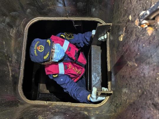 1分钟不到,海关监管艇便来到船舶旁边。海浪不停翻涌,监管艇刚靠近又被推开。杨磊看准时机,迅速跳到船舶上,王泽远也来不及犹豫,后撤一步再往前冲,跨步跃上船舶,和其他同事迅速将船舶控制起来。一番搜索后,王泽远发现,船上有2名自称是渔民的船员,但连一条鱼获都没有,只有船舱的上方堆满了数百个网笼,把甲板和船舱遮掩得严严实实。