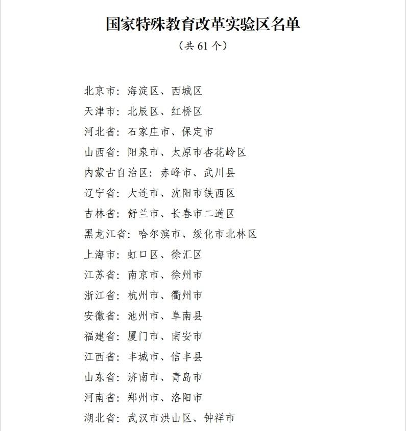 为深入贯彻党的二十大、二十届三中全会和全国教育大会精神,认真落实《国务院办公厅关于转发教育部等部门“十四五”特殊教育发展提升行动计划的通知》(国办发〔2021〕60号)有关要求,教育部组织开展了国家特殊教育改革实验区推荐工作。经各地自主申报、省级推荐、网络公示等环节,认定北京市海淀区等61个国家特殊教育改革实验区,现将名单予以公布,并就有关要求通知如下。