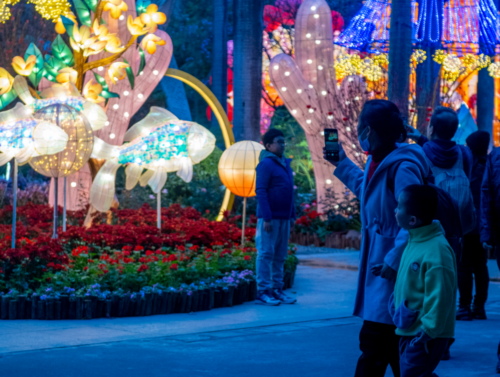 今年,2025年粤港澳大湾区灯会更是盛大。在广州南沙区,在南沙蒲洲花园、南沙天后宫景区、南沙滨海公园等三个园区,218组灯景,超过10000盏彩灯,沿着超过3公里的主游线路铺设开来,构成了目前国内规模最大、灯组最多、展期最长的“超级灯会”。华灯初上,璀璨星河映照湾区。“现实版的国色芳华!”有市民如此点赞。