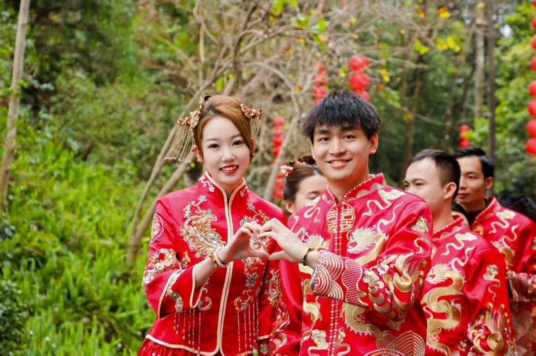 在云山珠水的见证下,九对新人在吉星石广场举行了庄重而浪漫的集体婚礼仪式。新人们身着华丽的中式龙凤褂,新娘以红盖头轻遮娇颜,新郎胸前佩戴着鲜艳的红花。他们遵循着传统中式婚礼的古老仪式,依次进行了掀盖头、结发同心、跨马鞍、对拜天地、喝交杯酒、庄严宣誓等温馨环节,生动展现了中华婚俗文化的深厚底蕴与独特魅力。活动还特别邀请了港澳台同胞及国际友人参与,他们沉浸于这场中式婚礼的仪式与流程之中,留下了难忘而美好的记忆。
