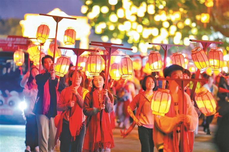 当晚超10万盏彩灯似星河璀璨,丰富演艺节目精彩纷呈。万名领到福灯的游客跟随“财神”组成巡游队伍,形成喜气洋洋的“灯龙”,在灯火璀璨的园区里灵活流动,共同祈愿新的一年平安顺遂、幸福美满。活动尾声,万人齐聚天后广场高举福灯,目光所及尽是流光溢彩。